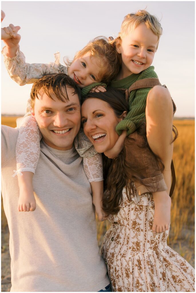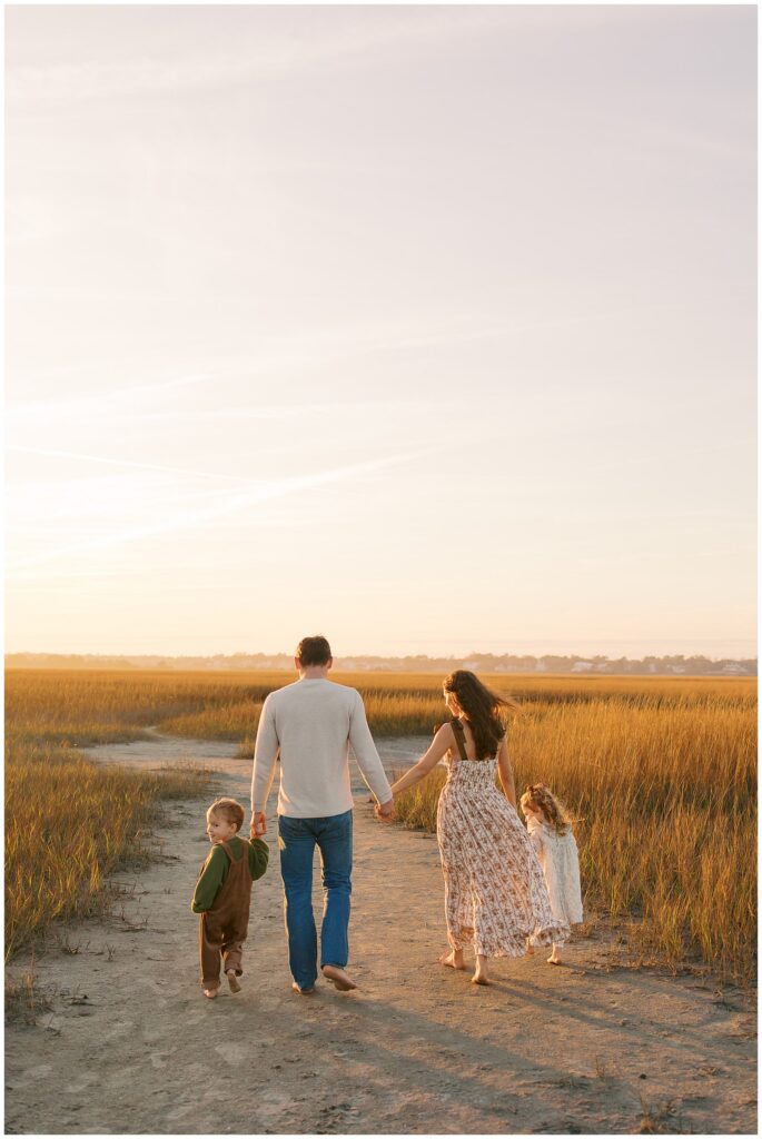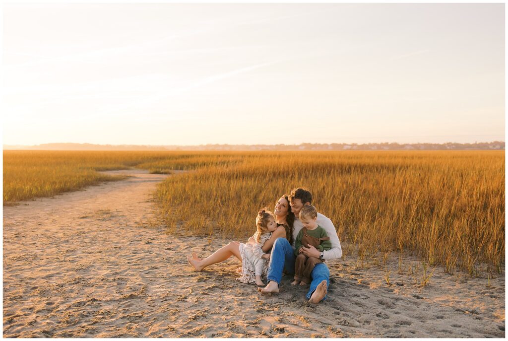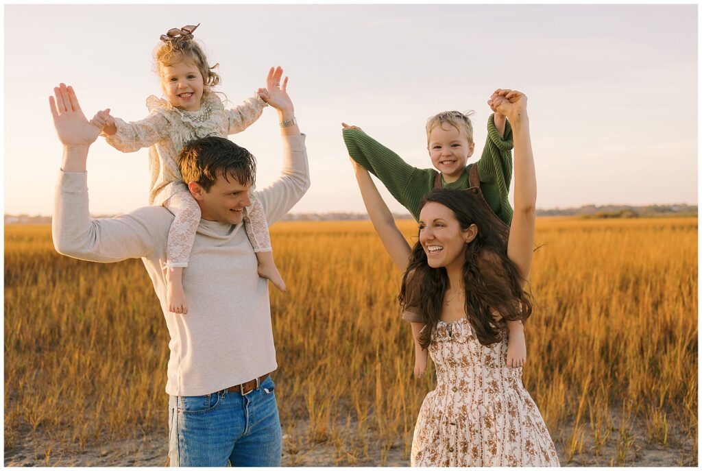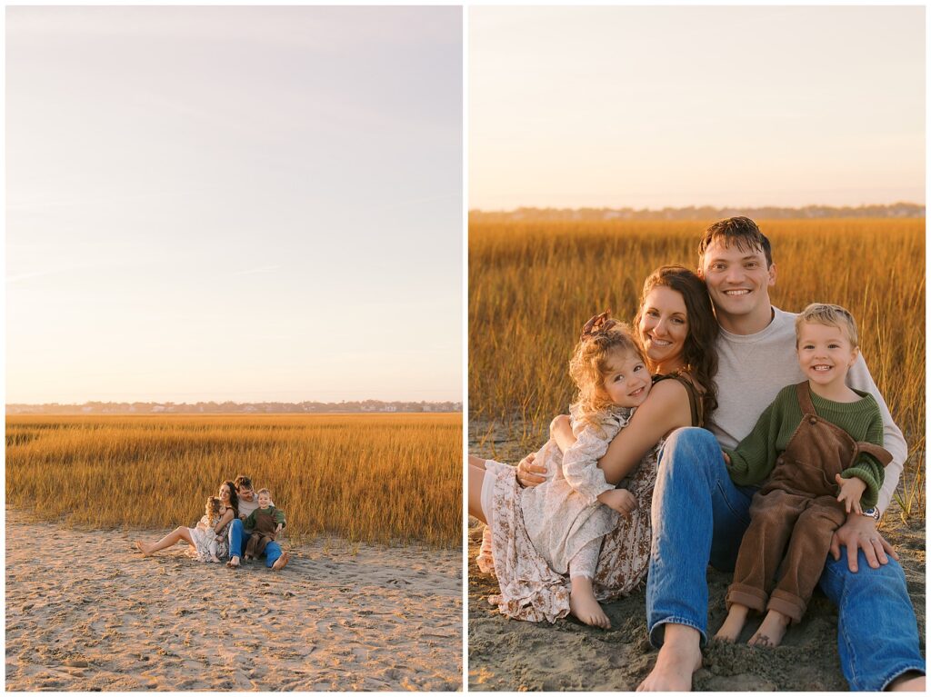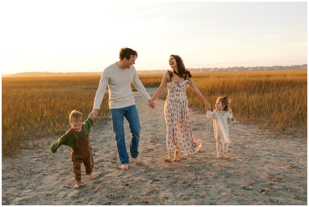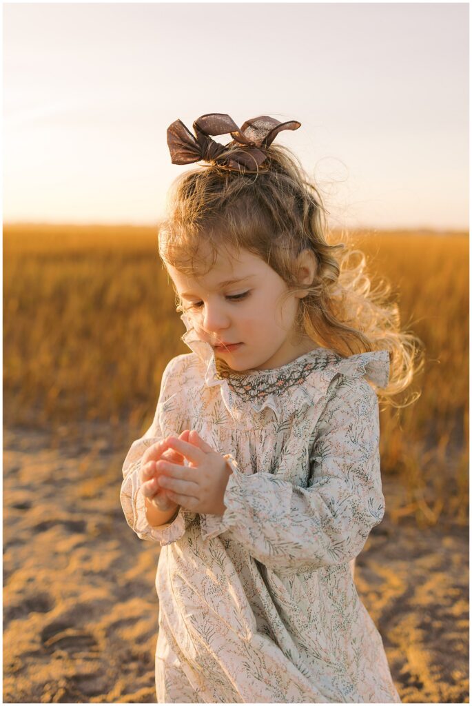 This recent family session at Wrightsville Beach, just outside Wilmington, NC, was full of play, laughter, and those quiet in-between moments that end up meaning the most. The mom borrowed one of my fave client closet dresses, and paired it with the cutest green cardigan (you’ll see it later in the blog). We got sososo lucky with a rando 70 degree sunny day in January! I couldn’t believe it!! I HAVEEE to share the golden hour glow we captured on the marsh-side first! This was actually the end of their session, so the golden glow was insanely beautiful!