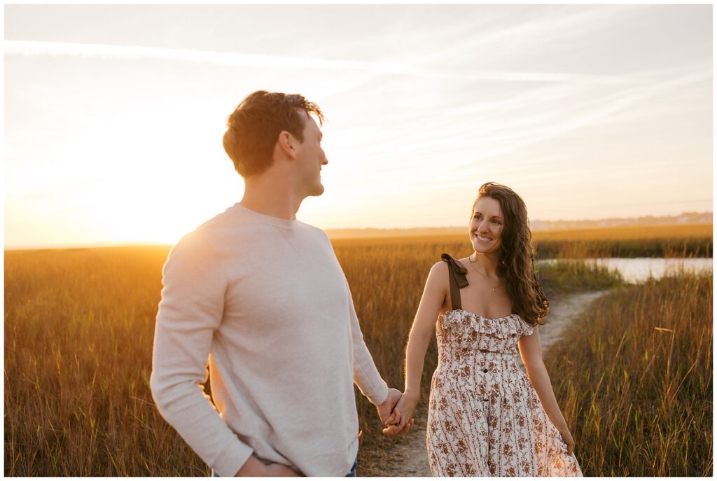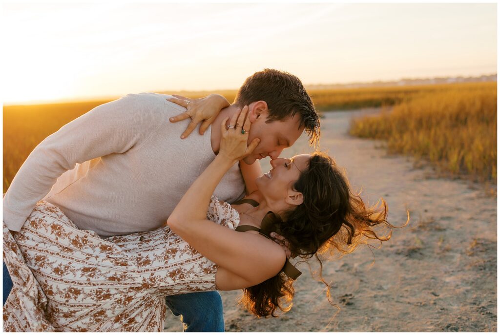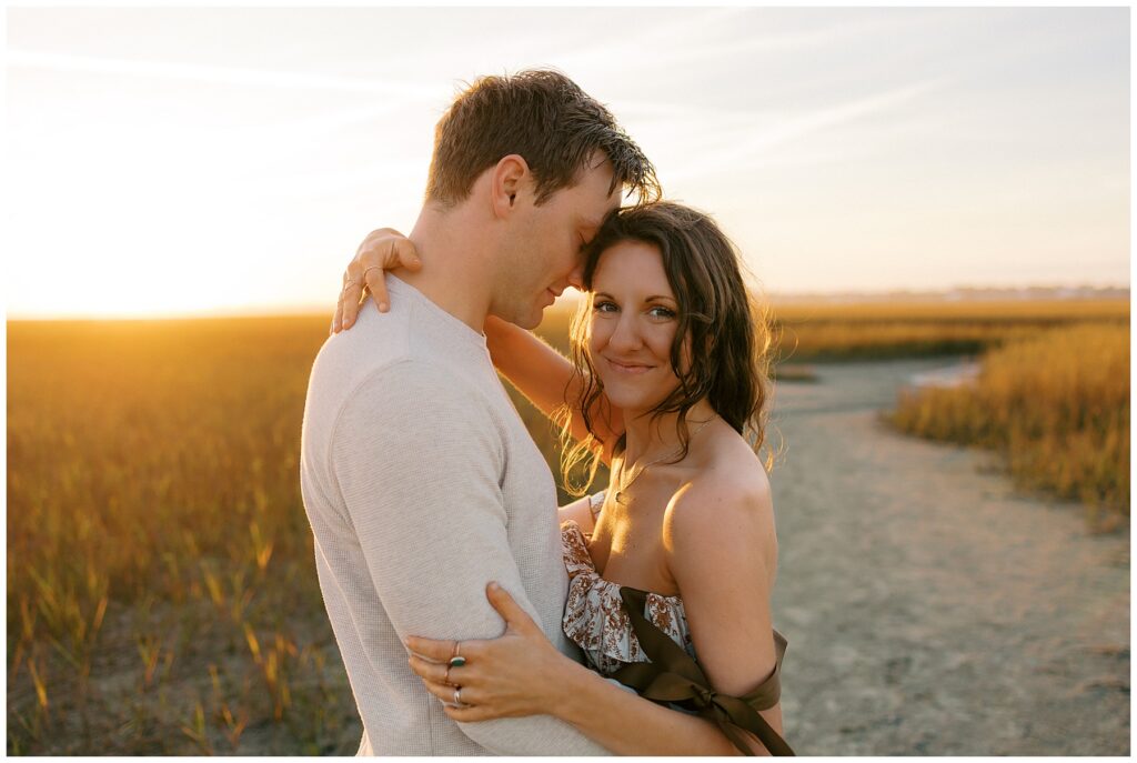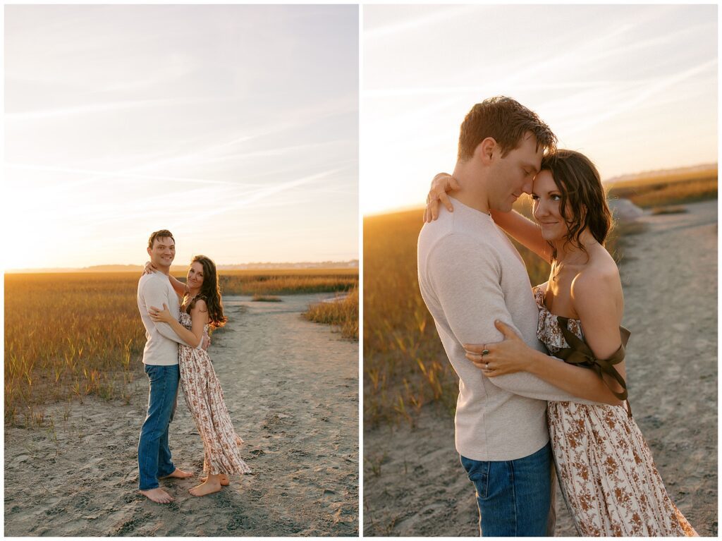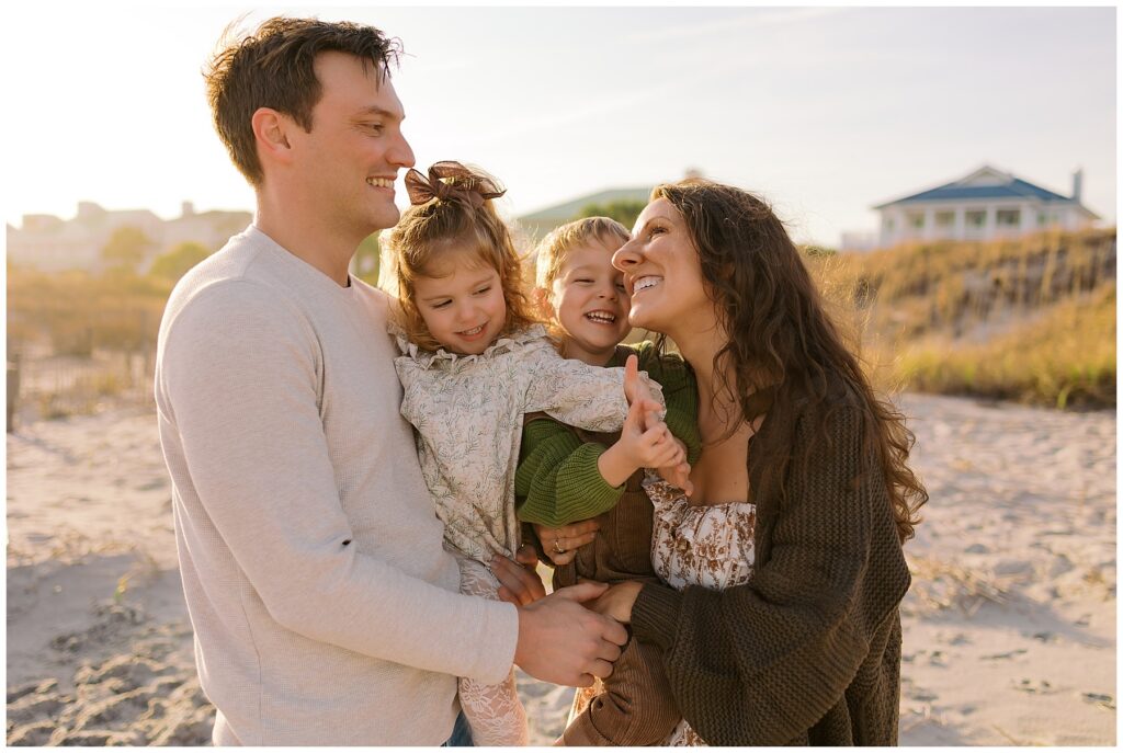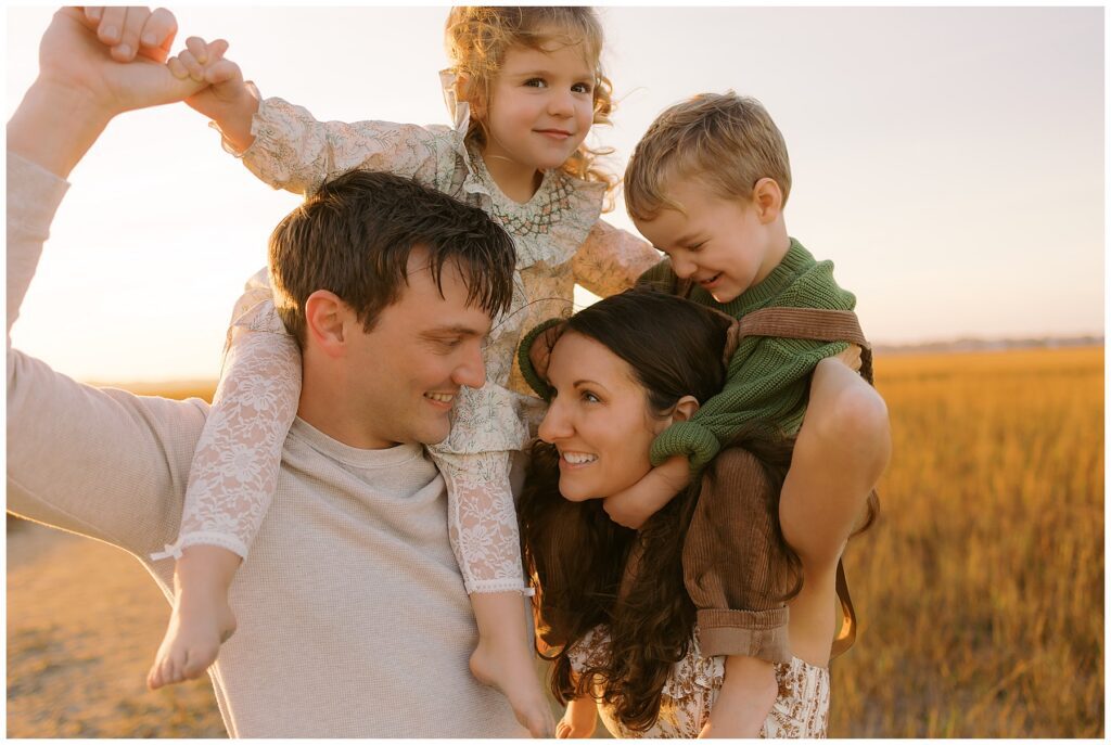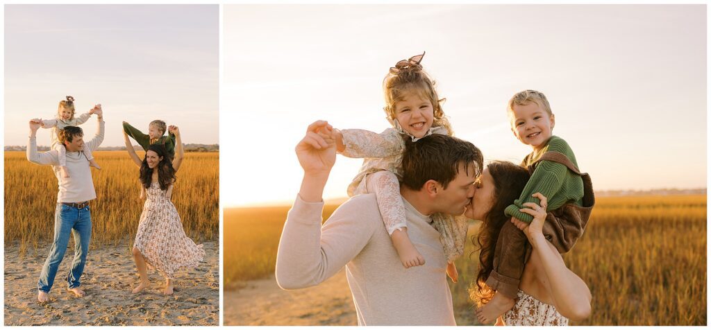 This recent family session at Wrightsville Beach, just outside Wilmington, NC, was full of play, laughter, and those quiet in-between moments that end up meaning the most. The mom borrowed one of my fave client closet dresses, and paired it with the cutest green cardigan (you’ll see it later in the blog). We got sososo lucky with a rando 70 degree sunny day in January! I couldn’t believe it!! I HAVEEE to share the golden hour glow we captured on the marsh-side first! This was actually the end of their session, so the golden glow was insanely beautiful!